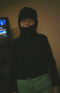 Yes, you see correctly! She’s got on a long sleeve turtle neck, sweat pants and a winter knitted hat that covers the neck. At one point, she was duck taping the sleeves and cuffs of the pants to her body…aye yup. She tossed that thought out for around the wrists but she still may have purple duck tape around her ankles still.